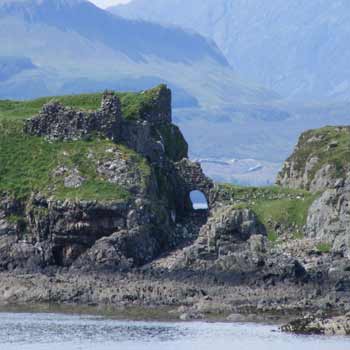 A three-storey tower house was built on the Viking castle site in the late 1400s which became a MacKinnon stronghold. It was abandoned for more comfortable accommodations in 1601, and this structure is the one seen today, sadly in ruins.